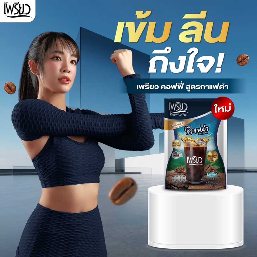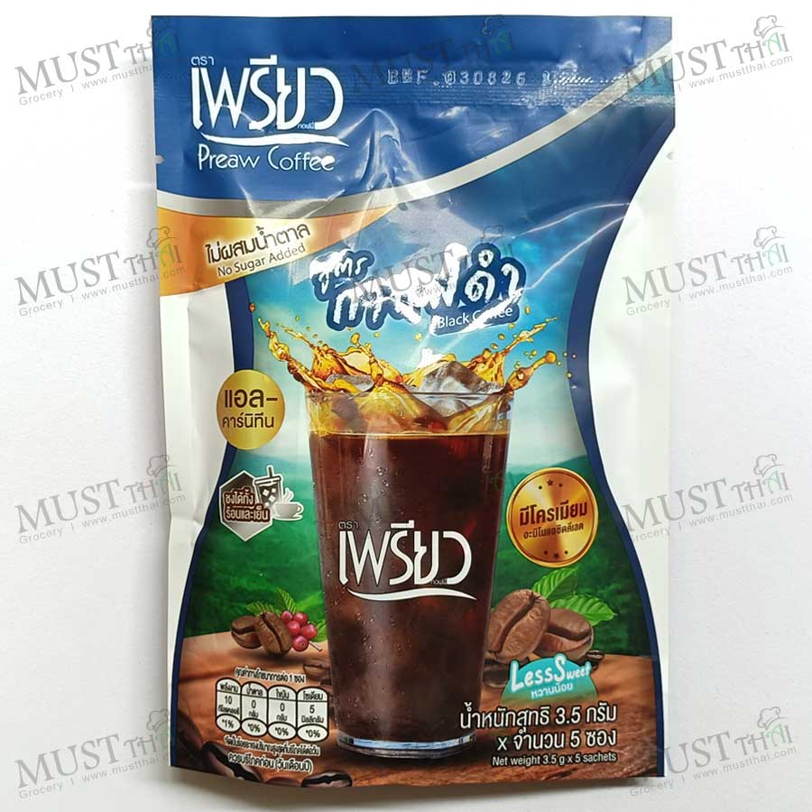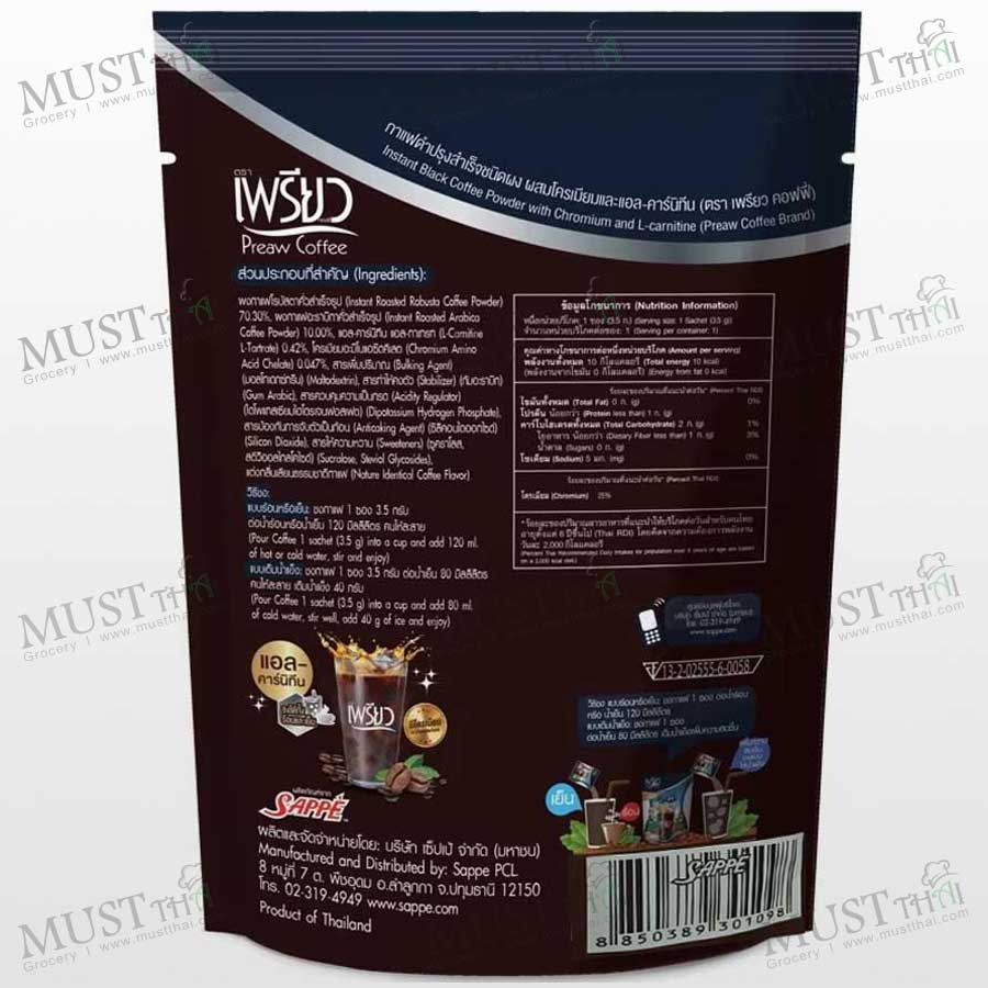 Preaw Instant Black Coffee Contains unroasted coffee bean extract and L-Carnitine, which helps in converting accumulated fat into energy. No Sugar Added, No Cholesterol and Low Calories 10 Kcal.