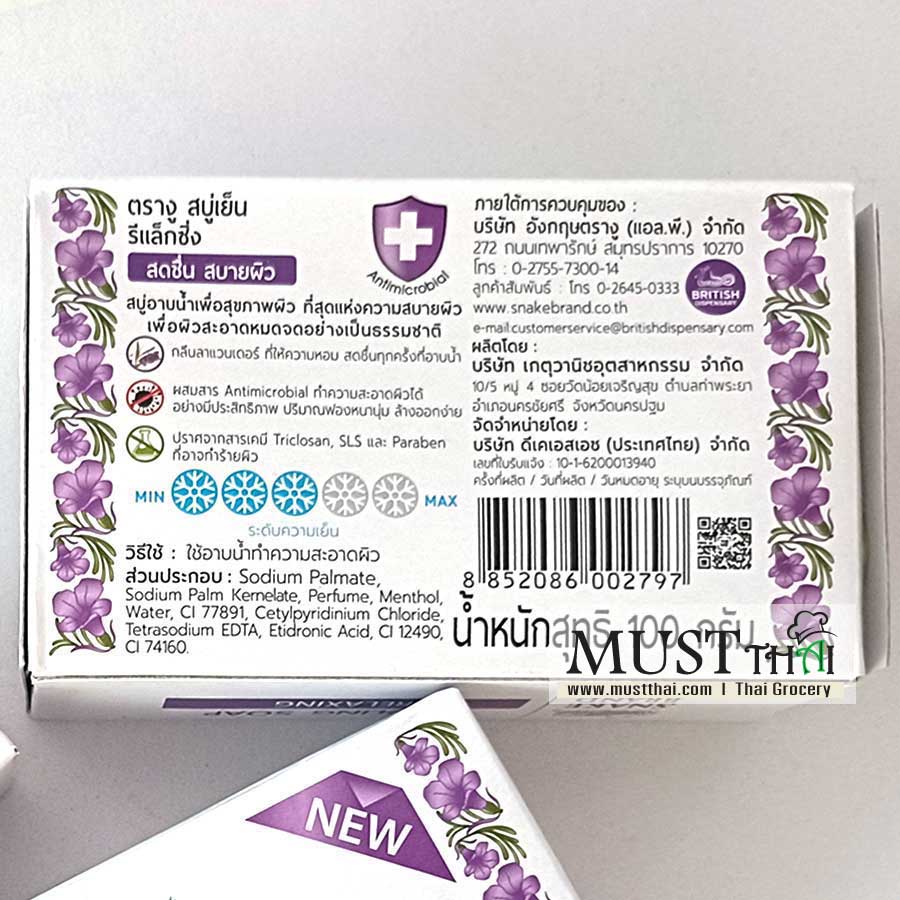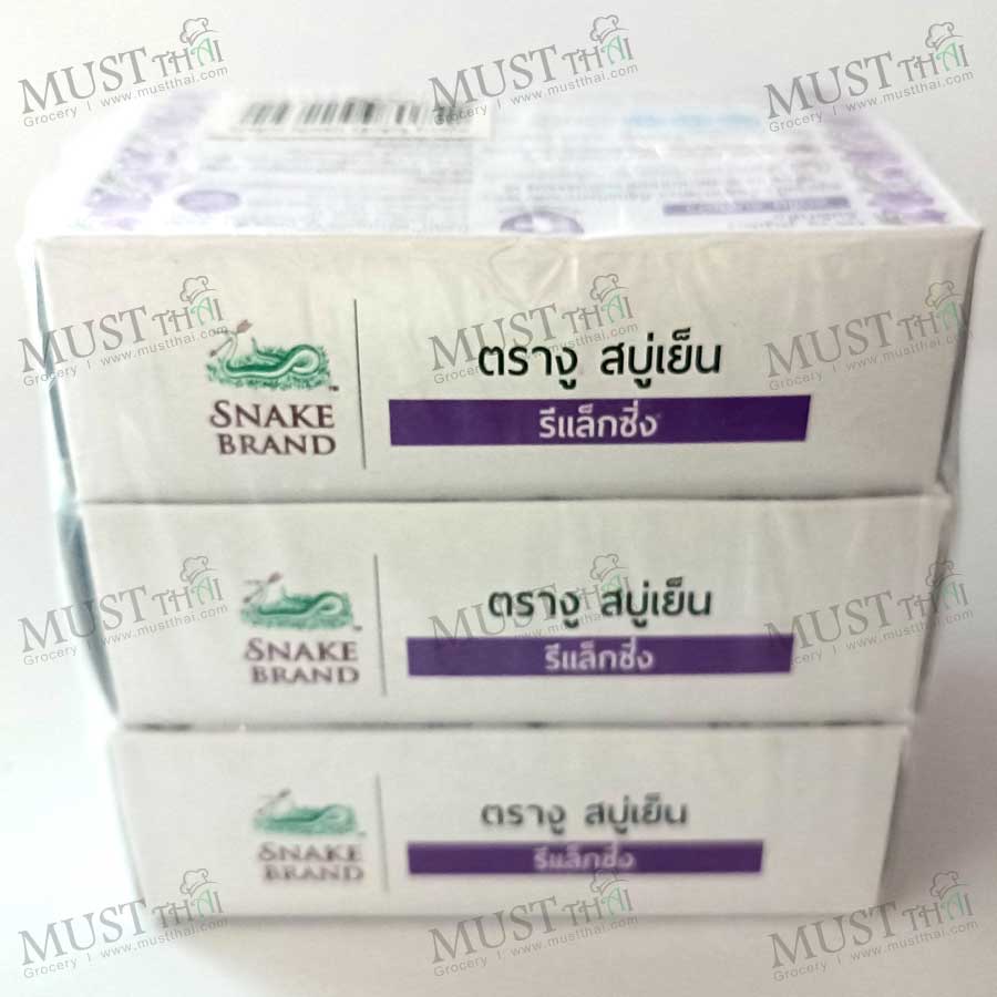 Snake Brand Relaxing Cooling bar Soap with Lavender scent, Relaxing Refreshing, Comfortable Skin. The ultimate comfort for skin, for naturally clean skin, Lavender scent that gives a refreshing scent every time you shower. Mixed with Antimicrobial substances, effectively cleanses the skin, thick and soft foam, easy to rinse. Free from chemicals Triclosan, SLS and Paraben that may harm the skin.