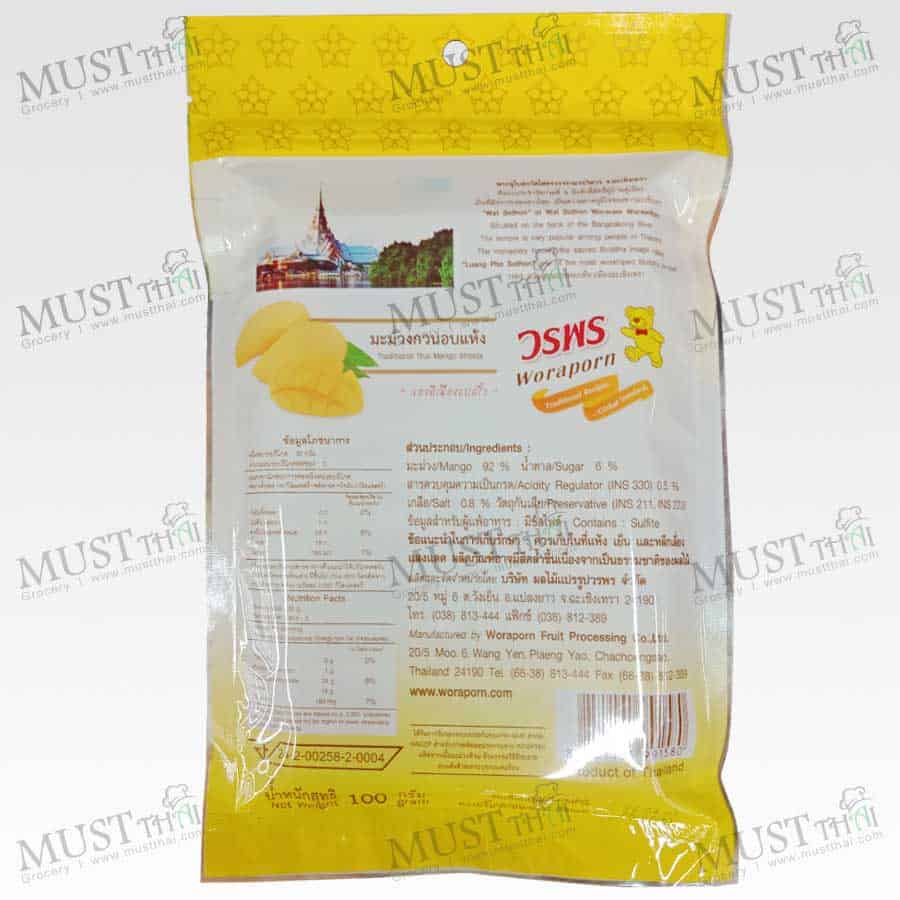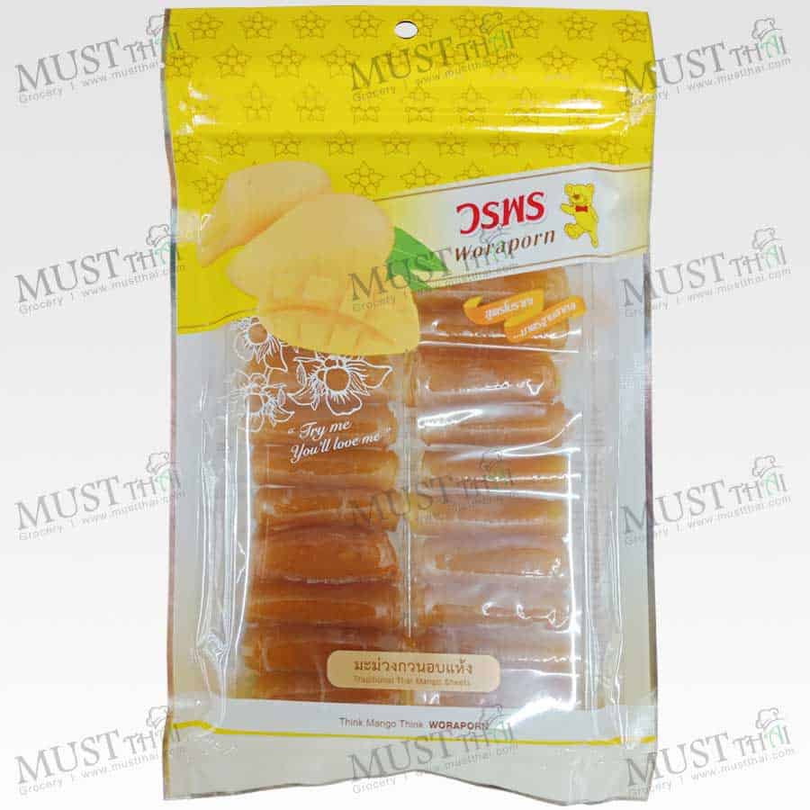 Thai Fruit Mango Sheet for Healthy OTOP Thailand. Mango made into sweetened and dried fruit roll-up sheets. Thai fruit snack made from very old recipe. “Woraporn” brand is Thailand’s top brand producing high quality mango product. Legislation Passed the GMP HACCP Quality Assurance System is Certified for the Production of Mango From Moody International Certification Ltd.