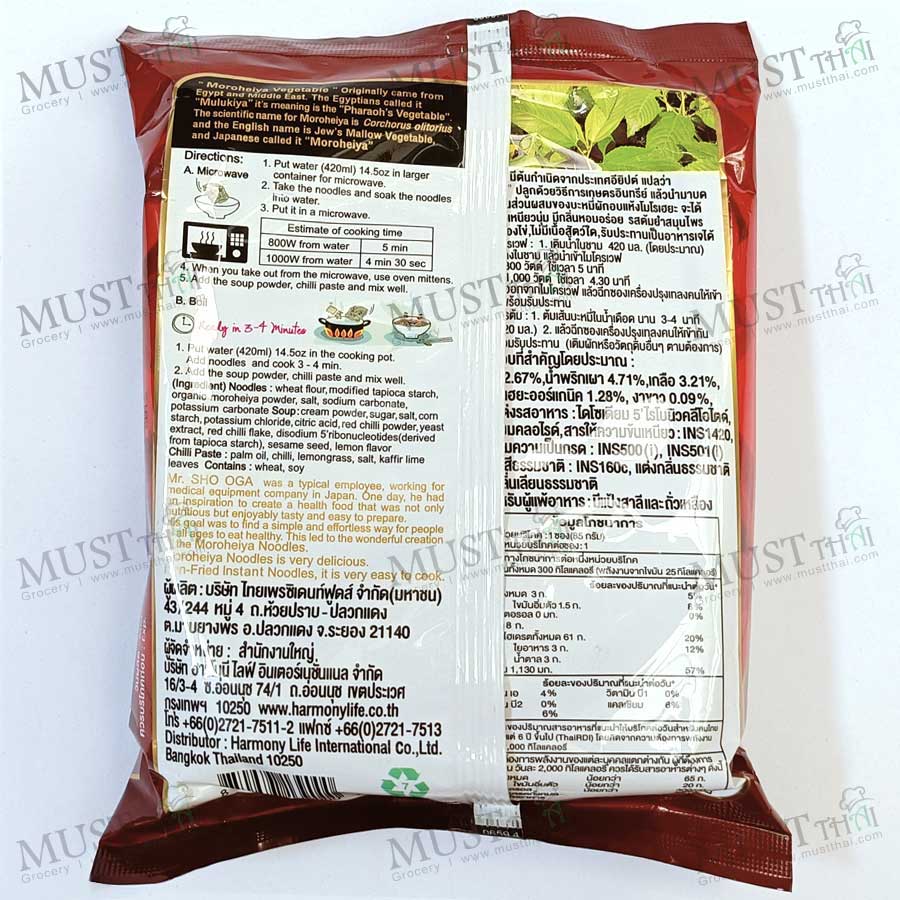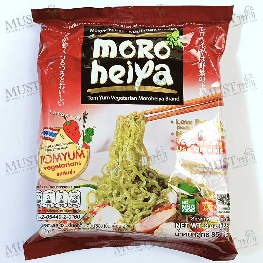 Moroheiya non fried Noodles Enjoy the delicious and stay healthy with Moroheiya Veggie Instant Noodles Tom Yum Flavor. A noodle made from Moroheiya that originally came from Egypt making a green tender noodle that had a mushroom smell. No egg and meat contaminated. Perfect for everyone and vegetarian.